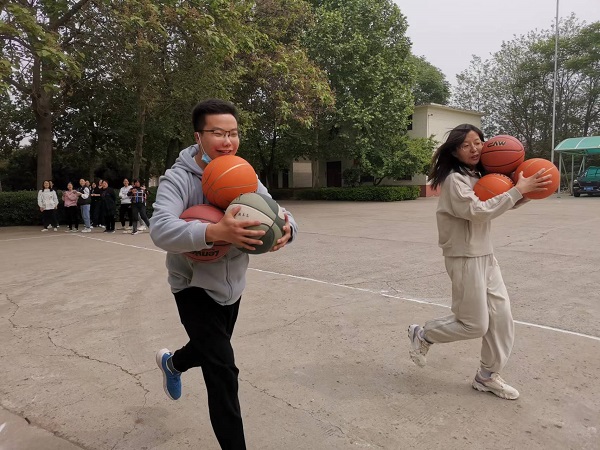 “誰先來?抱球游戲升級——1人抱4個籃球向前奔跑,過程中一個球也不得落地,否則成績無效?!辈门兄坏膶徲嬁崎L談增迫不及待地宣布。“個子高的胳膊、腿長,有優(yōu)勢,先上?!比巳豪镉腥颂嶙h,工程科身高一米八的帥小伙劉文浩和綜合辦高個子王春影舉手示意,跑道上呈現(xiàn)二人灑脫、漂亮的抱球姿勢。