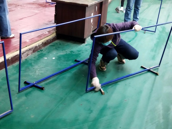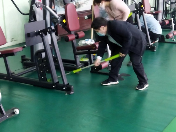 參與活動的20余名同志,分工合作,雖然大家來自不同部門、不同崗位,但爭先恐后、合作默契,清理地面、擦拭健身器材、清潔桌凳?!扒懊娴哪型緜兗佑土?,我們快趕上你們了!”負責拖地的九分公司主任經(jīng)濟師劉彩在后面說道。“這個乒乓球擋布拿抹布擦拭的效果不太好,用外面的高壓水槍沖洗試試吧!”九分公司主任會計師付世芳一邊用抹布擦拭擋布一邊提出自己的合理化建議,“這個辦法好!”九分公司綜合辦公室主任張路平同意道。