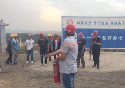 項目部即將進(jìn)行墊層混凝土澆筑施工,現(xiàn)場有大量的木模板、油漆等易燃品,正值高溫季節(jié),火災(zāi)隱患較大。項目部結(jié)合現(xiàn)場實(shí)際組織了本次消防演練,演練分為消防知識培訓(xùn)和火災(zāi)事故演練兩部分。演練前項目經(jīng)理李宏偉通報了溫嶺槽罐車爆炸事故造成的嚴(yán)重后果,闡明本次演練的目的和意義。隨后項目部安全員王東春對滅火常識、火災(zāi)逃生方法、滅火器如何使用等進(jìn)行了講解,并演示了手提式干粉滅火器的具體使用方法,參與演練的人員親自體驗(yàn)了滅火器的使用。