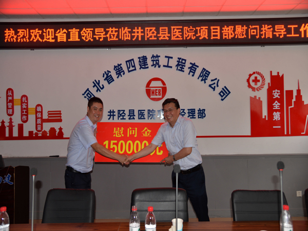 7月26日下午,河北省直工委副書記范金龍一行到二分公司井陘縣醫(yī)院項目部,對奮戰(zhàn)在一線的職工進(jìn)行暑期慰問,為他們送來了慰問金和慰問品。集團(tuán)工會主席王文利、公司黨委副書記、紀(jì)委書記、工會主席李懷生、二分公司黨總支書記孫立鋒一同參加。