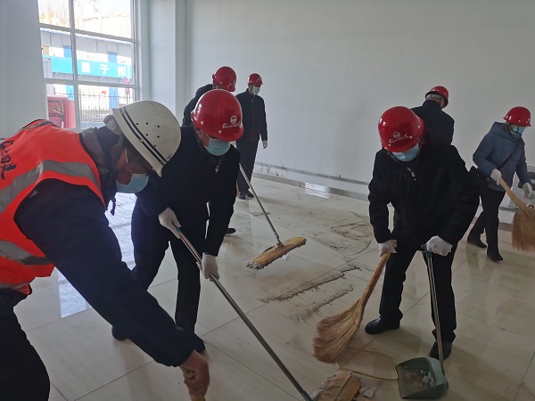 一到現(xiàn)場,黨員們就摩拳擦掌、躍躍欲試。項目經(jīng)理首先向?qū)O長虹一行簡單介紹了項目基本情況和現(xiàn)場安全注意事項后,省直工會的黨員們就戴上安全帽,直奔輔助工房三區(qū)。他們手持拖布、笤帚在一層室內(nèi)清理地板磚、整理雜物、倒運垃圾,干得熱火朝天。大家不顧室內(nèi)的灰塵,認真地清理著地面上的雜物、清掃著每個角落。經(jīng)過緊張工作,黨員們把三區(qū)一層房間和走廊打掃得干干凈凈,把裝飾材料、防水材料等雜物碼放得整齊有序。現(xiàn)場工人看到黨員們不怕臟,不怕累的勞動,都紛紛稱贊。勞動結(jié)束,在業(yè)主的帶領下,孫長虹、李懷生等黨員參觀了已經(jīng)完工、正在試運行的制梗生產(chǎn)線。