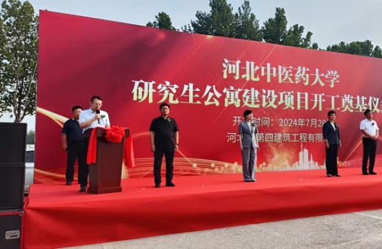 奠基儀式現(xiàn)場(chǎng),挖掘機(jī)、裝載機(jī)身披大紅花整齊排列,猶如即將出征的戰(zhàn)士,工人整裝待發(fā),信心滿滿、斗志昂揚(yáng)。儀式在歡快激昂的樂(lè)曲聲中拉開序幕。主持人首先介紹了參加本次儀式的相關(guān)領(lǐng)導(dǎo)和項(xiàng)目概況。隨后,唐志強(qiáng)作為施工單位代表首先發(fā)言,“我公司有幸承接該施工任務(wù),充分體現(xiàn)了項(xiàng)目主管部門和建設(shè)單位對(duì)我們國(guó)有建筑企業(yè)的信任和支持。河北四建一定高標(biāo)準(zhǔn)、嚴(yán)要求,為項(xiàng)目順利實(shí)施提供有力保證,為業(yè)主提供滿意服務(wù),為河北中醫(yī)藥大學(xué)醫(yī)學(xué)教育的高質(zhì)量發(fā)展貢獻(xiàn)力量!”最后,學(xué)校黨委副書記孫士江表示,河北中醫(yī)藥大學(xué)研究生公寓為省政府支持骨干大學(xué)建設(shè)項(xiàng)目,希望參建各方全力以赴確保按時(shí)完工投入使用,建設(shè)“品質(zhì)工程”“一流工程”,促進(jìn)學(xué)校各項(xiàng)事業(yè)取得新成就,為經(jīng)濟(jì)強(qiáng)省、美麗河北建設(shè)作出新的更大貢獻(xiàn)!