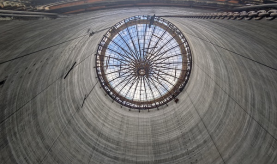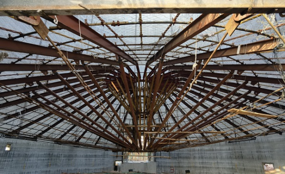 體系設計優(yōu)化,拼裝提速?!颁摻罨炷镣矀}錐殼頂板架空支撐施工工法”依托糧食類筒倉工程,筒倉建筑高度高達50米,內徑26米,倉頂設計為錐殼頂、平頂雙層結構,斜錐殼板厚0.2米。以往筒倉倉壁一般采用滑模施工,錐殼頂板施工復雜,一般采用H型鋼組裝成圓柱形核心筒、外輻射鋼桁架平梁的方式組裝成支撐平臺,重21.9噸,用鋼量大,制作成本高;節(jié)點連接采用焊接,拼裝速度慢,無法滿足群體筒倉的周轉時效。分公司針對傳統(tǒng)做法的弊端,組織科研小組,專項研究,破解難題,最終形成了空間鋼桁架——拉索組合結構支撐體系。該體系摒棄了3.2米直徑的圓柱型核心筒,采用直徑2.6米的傘狀中心筒,通過五道環(huán)梁環(huán)向拉接,無需設置斜撐,原結構減輕將近1噸,節(jié)約了制作成本,而且承壓能力更強。重點節(jié)點還改用了高強螺栓連接代替焊接,拼裝速度明顯提升,施工速度更快。