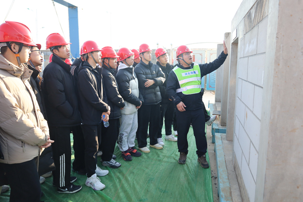 下午14:00,活動準時開始?;顒臃譃閷嵉貐⒂^和座談兩個環(huán)節(jié)。參觀前,項目經(jīng)理李士寧為大家進行了安全教育培訓。隨后,李士寧將學生分為質(zhì)量、技術(shù)、安全三個組別,由相關(guān)人員帶領(lǐng)到現(xiàn)場參觀。參觀過程中,相關(guān)人員圍繞項目生產(chǎn)經(jīng)營情況,深入淺出地向師生們講解了技術(shù)管理、質(zhì)量管理、安全管理方面的知識,同時回答了學生們的提問。在參觀醫(yī)療康復樓的時候,學生們好奇地問“這是什么?”項目技術(shù)負責人告訴他們那是盤扣式腳手架,并介紹了組成架體的構(gòu)件。學生們紛紛表示,這樣“零距離”參觀,不僅有助于把理論知識和實踐應用相結(jié)合,更讓他們了解到了最前沿的施工技術(shù),同時感受到了河北四建公司正規(guī)化、標準化的管理,受益匪淺。