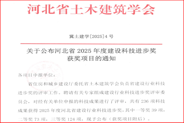 7月3日,河北省土木建筑學(xué)會(huì)公布了2025年度河北省建設(shè)科技進(jìn)步獎(jiǎng)名單。公司憑借扎實(shí)的科技創(chuàng)新與技術(shù)攻關(guān)能力,一舉斬獲16項(xiàng)科技成果獎(jiǎng)項(xiàng),其中,一等獎(jiǎng)1項(xiàng)、二等獎(jiǎng)4項(xiàng)、三等獎(jiǎng)11項(xiàng)。