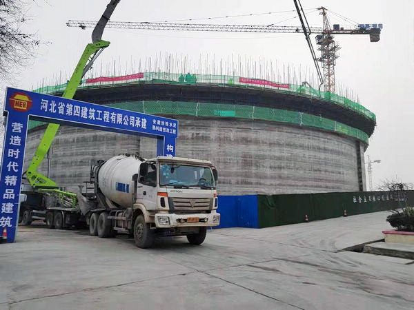 熟料儲(chǔ)存及輸送筒倉(cāng)直徑60米,高20.5米。1月11日,業(yè)主項(xiàng)目負(fù)責(zé)人王利杰組織召開(kāi)專題會(huì)議,鄭重要求1月20日前滑模施工必須完成。面對(duì)業(yè)主早日投產(chǎn)的殷切期盼,項(xiàng)目部緊急組織施工策劃,明確搶進(jìn)度措施辦法,全體動(dòng)員,多點(diǎn)發(fā)力,全力以赴?;J┕?。在動(dòng)員會(huì)上,成立了以項(xiàng)目經(jīng)理為組長(zhǎng)的滑模領(lǐng)導(dǎo)小組,班子帶班,明確責(zé)任目標(biāo);與作業(yè)班組簽訂安全、質(zhì)量承諾書,增強(qiáng)其責(zé)任意識(shí);購(gòu)置鋼筋間距測(cè)量設(shè)備,節(jié)省驗(yàn)收鋼筋工程時(shí)間和人力。由于疫情原因,現(xiàn)場(chǎng)勞力不能迅速到位,項(xiàng)目部提前組織管理人員晚上加班吊運(yùn)鋼筋、水泥、腳手板等材料,大家高漲的干勁兒在滑?,F(xiàn)場(chǎng)起到了積極的帶動(dòng)作用。庫(kù)壁預(yù)應(yīng)力鋼絞線設(shè)置較為密集,每間隔26厘米一道,而且?guī)в腥嵝?,往?kù)壁鋼筋內(nèi)穿設(shè)時(shí)容易跑偏,工作效率低。為加快施工,技術(shù)人員巧妙地在庫(kù)壁鋼筋上加設(shè)了U型鋼筋固定鋼絞線穿行位置,然后大家一字排開(kāi),“一二、一二……”齊聲喊著口號(hào),有節(jié)奏地用力將鋼絞線在庫(kù)壁鋼筋里穿行直到扶壁柱。數(shù)九隆冬的夜間滑模平臺(tái)上氣溫很低,但是大家的工作熱情不減,干勁不退,抬鋼筋、綁鋼筋、穿鋼絞線……,干得熱火朝天,沒(méi)有人叫苦喊累,在大家的共同努力下,滑模以每天2.7米的速度快速推進(jìn)。