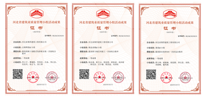 5月15日,七分公司申報的“提高防水卷材SBS一次封邊合格率”“提高剪力墻層間施工一次驗收合格率”“提高混凝土裝配式免拆板安裝一次驗收合格率”三項QC成果,被河北省建筑業(yè)協(xié)會評為“一等成果”。這不僅是河北省建筑業(yè)協(xié)會對分公司技術(shù)創(chuàng)新能力的高度認(rèn)可,更是分公司扎實開展QC小組活動、有效攻克施工難題、提升項目施工質(zhì)量的生動寫照。