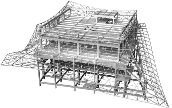 該工程表皮結(jié)構(gòu)采用圓鋼管相貫焊接的單層鋼網(wǎng)格結(jié)構(gòu),局部采用平面鋼桁架,表皮鋁板采用白色穿孔鋁板,雙曲穿孔鋁板外圈穿孔位置距邊線(xiàn)20mm,其余穿孔位置為不規(guī)則孔。面對(duì)外裝飾層鋼結(jié)構(gòu)造型復(fù)雜、精度要求高等挑戰(zhàn),項(xiàng)目部依托BIM技術(shù)構(gòu)建數(shù)字化解決方案,通過(guò)Tekla軟件精確計(jì)算桿件內(nèi)力和優(yōu)化拼裝單元,將傳統(tǒng)的二維圖紙轉(zhuǎn)化為三維可視化模型,便于更直觀(guān)地理解復(fù)雜節(jié)點(diǎn)和施工流程。利用Navisworks和BIMFILM軟件進(jìn)行施工動(dòng)畫(huà)模擬,通過(guò)三維可視化模型編排制作吊裝順序,形成吊裝三維演示動(dòng)畫(huà),優(yōu)化施工順序和工序銜接,確保施工安全、質(zhì)量,有效提高施工效率。引入智能測(cè)量技術(shù),以全站儀、電子水準(zhǔn)儀等設(shè)備實(shí)時(shí)監(jiān)控安裝精度,形成“模擬預(yù)判+動(dòng)態(tài)糾偏”的質(zhì)量保障體系。在鋼網(wǎng)架安裝前,將全站儀、電子水準(zhǔn)儀、GPS定位系統(tǒng)采集的數(shù)據(jù)進(jìn)行綜合對(duì)比分析,提高測(cè)量放線(xiàn)精度,通過(guò)實(shí)時(shí)數(shù)據(jù)監(jiān)控及時(shí)調(diào)整施工過(guò)程中的誤差,實(shí)現(xiàn)動(dòng)態(tài)糾偏。鋼網(wǎng)架拼裝單元安裝完成后,通過(guò)實(shí)際測(cè)量采集數(shù)據(jù)與模型進(jìn)行對(duì)比,修正調(diào)整施工誤差。此外,項(xiàng)目部通過(guò)無(wú)人機(jī)掃描技術(shù)對(duì)安裝后的鋼結(jié)構(gòu)骨架成品空間坐標(biāo)進(jìn)行驗(yàn)收,為后續(xù)鋁板表皮安裝提供精準(zhǔn)數(shù)據(jù),確保建筑外觀(guān)效果與設(shè)計(jì)一致。
